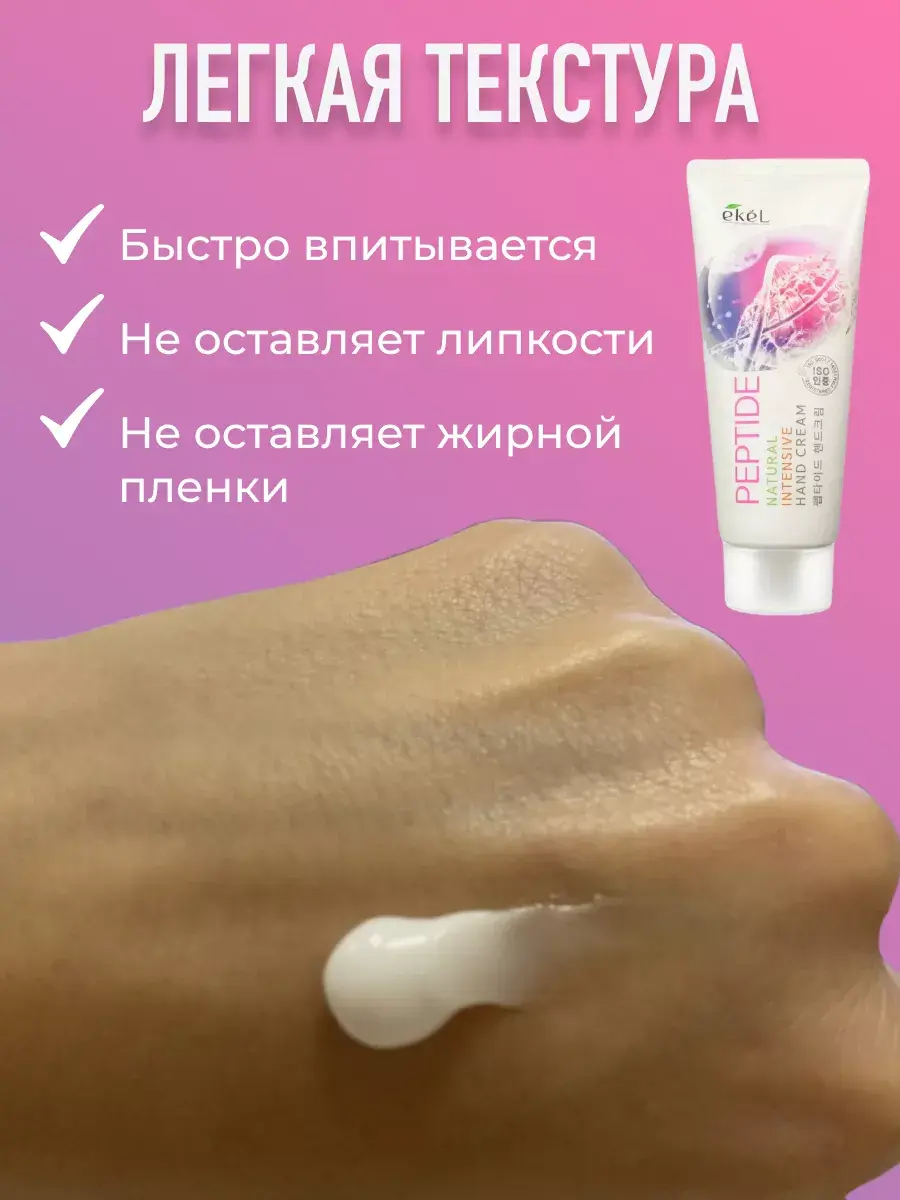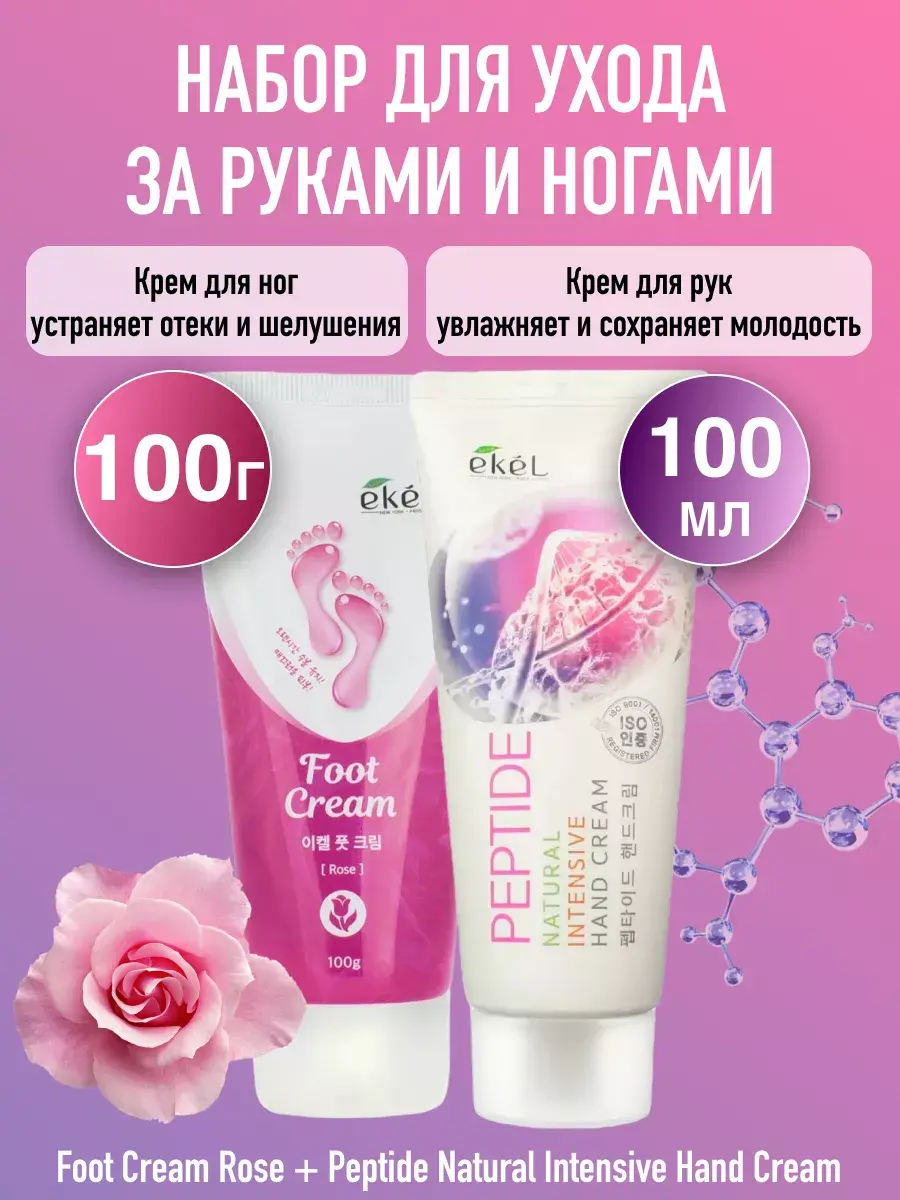 Встречайте идеальный уходовый набор продуктов для ваших рук и ног - корейские кремы с пептидами EKEL Peptide Natural Intensive Hand Cream и с ароматом розы EKEL Foot Cream Rose. Увлажняющий крем для рук и ногтей предназначен для комплексного ежедневного ухода за сухой и требовательной кожей. Трипептид меди-1 стимулирует синтез коллагена, эластина и гиалуроновой кислоты. А еще он подтягивает и разглаживает кожу. Олеиновая кислота обеспечивает глубокое и долговременное увлажнение и питание, оставляя кожу мягкой и бархатистой. Крем защищает от негативного воздействия внешних факторов и восстанавливает барьерные функции. Восстанавливает баланс влаги и гидролипидный слой даже у обезвоженной кожи. Идеальное сочетание увлажнения, питания и защиты для ваших ручек, отличное дополнение к вашей ежедневной рутине на благо красоты. Увлажняющий корейский крем для стоп EKEL Foot Cream Rose предназначен для борьбы с отеками и шелушениями на ногах. Созданный с учетом потребностей сухой кожи, он обеспечивает глубокое увлажнение и способствует заживлению трещин. Эффективно борется с сухостью и натоптышами, возвращая коже ног мягкость, гладкость и комфорт. Восстанавливает естественный баланс влаги кожи и успокаивает. Экстракт розмарина стимулирует кровообращение и заживляет повреждения. Результаты заметны уже после первых применений, и они улучшаются с каждым днем использования. Ваши стопы будут выглядеть ухоженными в течение всего года! При регулярном применении оба эти косметические средства станут незаменимыми помощниками для тех, кто хочет поддерживать кожу рук и ног в отличном состоянии.
